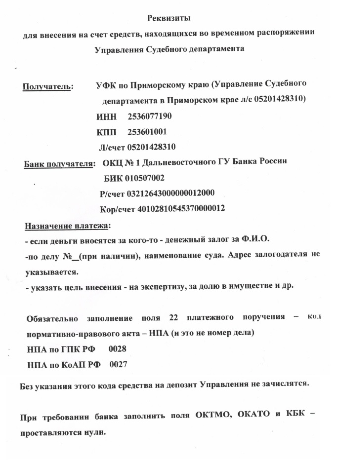 Реквизиты для внесения средств, находящихся во временном распоряжении Управления Судебного департамента